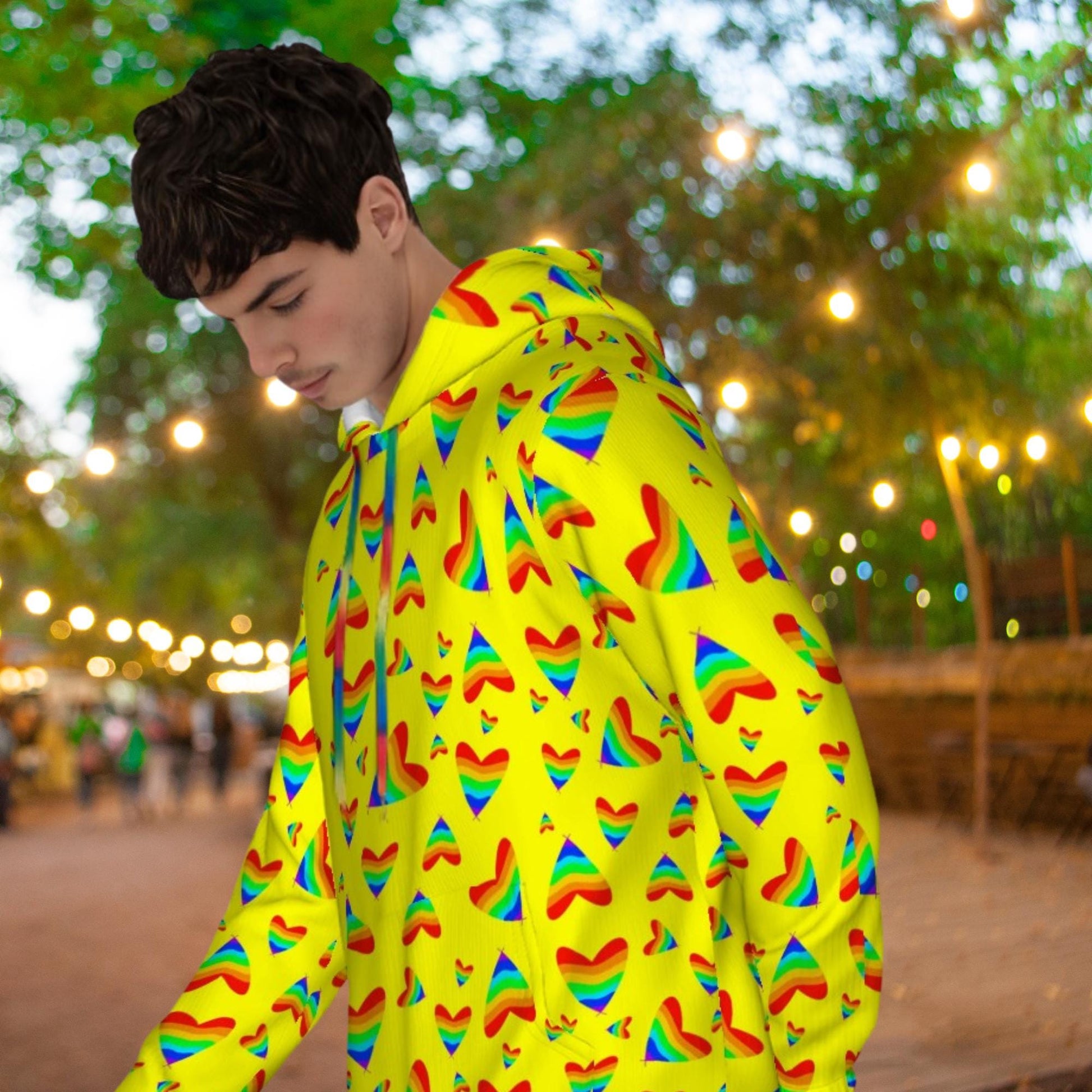 The Men's hoodie use of polyester fabric, feel comfortable, high elastic. Kangaroo pocket in front to store small everyday items, cuff hem elastic for a better fit. Full print, highlighting youth personality. With cap and colored cap rope.