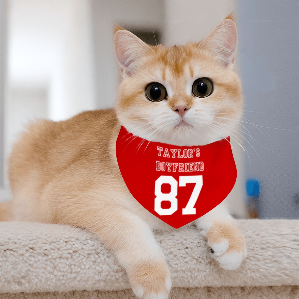 - Dress your pup in style with our Taylor's Boyfriend dog bandana, inspired by the iconic Travis Kelsey and Taylor Swift! This sporty re sport jersey bandana is perfect for canine fans and Swiftie households alike. Made from soft, durable fabric, it's comfortable for your furry friend and features a trendy design that showcases their love for the pop culture couple. Whether at the park or chilling at home, your dog will turn heads. Get ready for game day or a stroll with this must-have dog apparel!